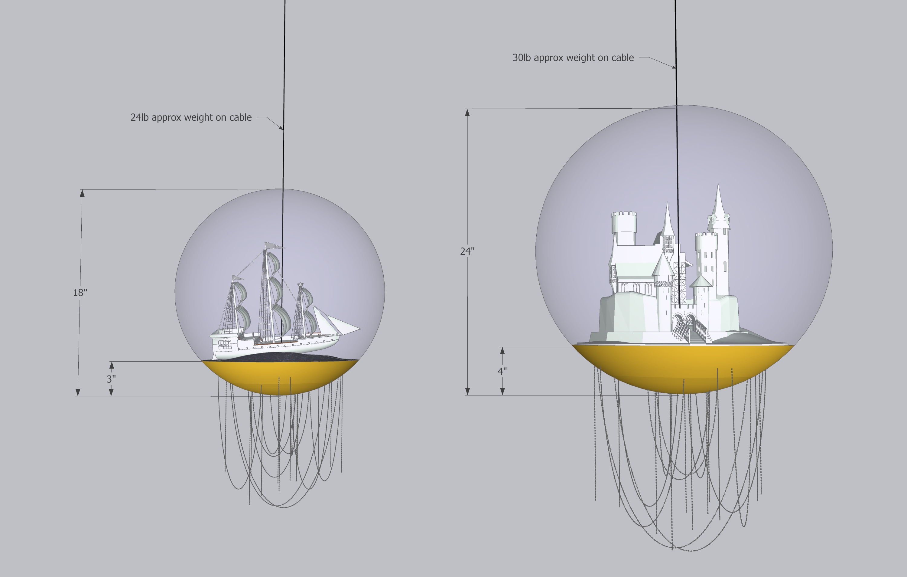 Miniature castles, tiny forests, alien planets, hot air balloons, little cities, and other landscapes will be housed inside. The domes are cradled by shiny brass dishes, holding the weight of each acrylic bubble.