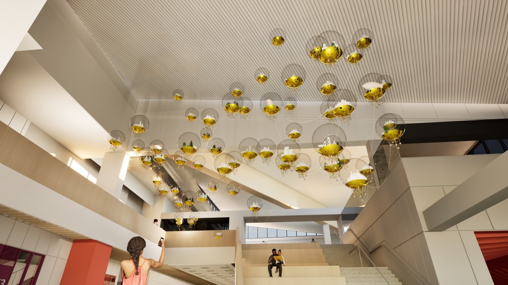 Landscapes of the Imagination is a swirling cloud of stories floating up into the atrium above Inspire. Miniature scenes will rise inside suspended bubbles, drawing from the folklore, fantasy, and fiction that feeds our collective imagination. Each bubble is based on a beloved book or story from a person in the community. These tales will be 3D printed, sculpted, and assembled inside the acrylic & brass spheres overhead – like escaped daydreams, whirling up towards the sky.